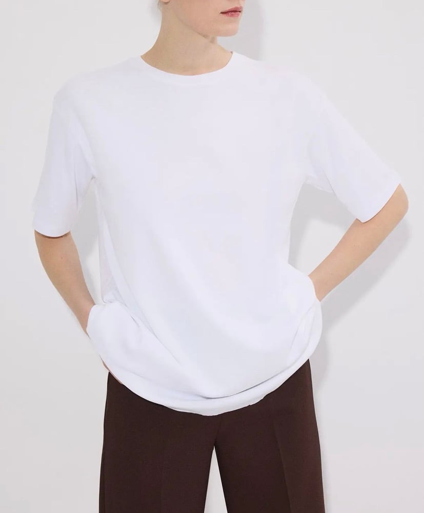 The perfect white tee is not an accident. This one earns its place — cut with a slightly oversized, relaxed silhouette that skims rather than clings, in a substantial cotton that holds its shape wash after wash. The clean crew neckline and curved hem keep it polished enough to tuck into tailored trousers or wear loose over wide-leg linen.